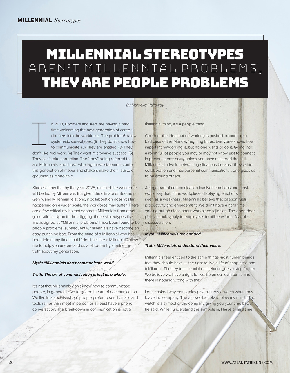 This article in the print version of The Atlanta Tribune presents current myths about millennials and what millennials really expect from more established generations.